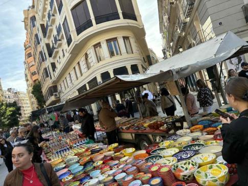 Vasárnap délelötti kézműves- és kerámiapiac a Plaza Redonda és a Plaza del Ayuntamiento közötti utcák egyikén - a fotón látható, kézzel festett valenciai kerámiák és tálak a régió egyik legjellemzőbb hagyományos termékei. Ugyanezen a “piactéren anno az akasztások is zajlottak:a jelenben minden békésebb. - Lantos Anikó fotója