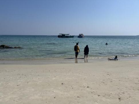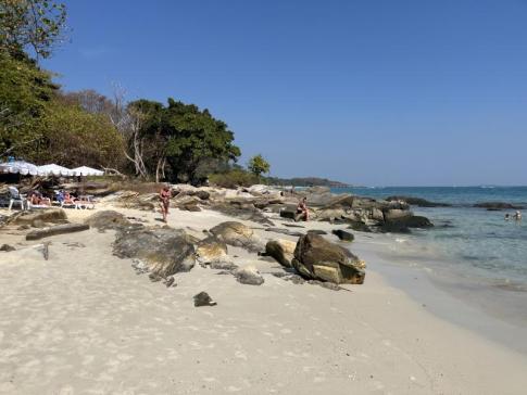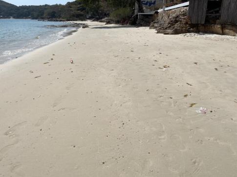 Olvastuk, hogy itt aztán ,,wow" élményünk lesz, és ez a sziget két legszebb strandjának az egyike. A tenger smaragdzöld színe megvan, az is jó, hogy kevés itt a fürdöző, a homokföveny rendben van, de itt-ott szemetet láttunk, a vízben még inkább. KIssé csalódottak voltunk. Egy-két európai önszántából gyűjtögette a papír- és műanyag hulladékot. A mélyütés azonban az volt, hogy a fürdéskor tőlünk nem messze egy lehorgonyzott hajó berregtette megállás nélkül a motorját. A part fölötti domboldal egy részén elég rossz állapotban lévő fabungalók sorakoztak. Olyan szomorkás hangulatot árasztottak. Továbbálltunk. (Aji, 2026. január)