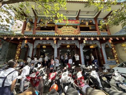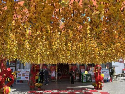 A bevásárlóközpont bejáratát sűrűn felfüggesztett sárga virágdekoráció borítja. Az ilyen díszítés Vietnámban jellemzően a Tết, azaz a holdújév időszakához kapcsolódik, és többnyire művirágokból készül. A sárga virágmotívum a hagyomány szerint a szerencsét és a gazdasági jólétet jelképezi. - K. Kriszta fotója