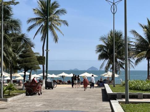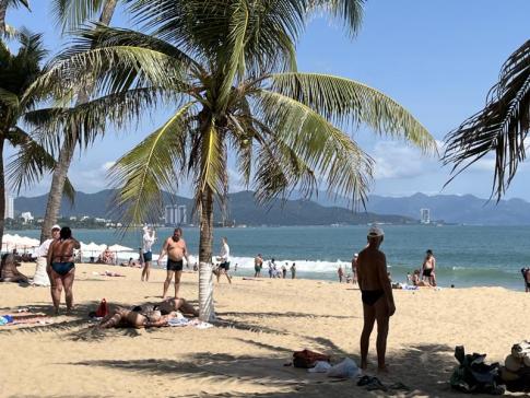A part persze nem olyan, mint egy thai tengeröböl, de vietnámi viszonylatban egészen szépnek számít. Mivel nem a belváros nagy, zsúfolt strandján voltunk, hanem attól távolabb, a homok itt viszonylag tiszta maradt. Napágyat és napernyőt olcsón lehetett bérelni – nélküle szinte lehetetlen lett volna a napon kibírni. Így is sok vörösre égett orosz turistát láttunk a homokon heverni. Délelőtt hamar megjelentek a mozgó árusok is, és kínáltak mindent, amit csak el lehet képzelni: főtt kukoricát, fánkot, homárt, napszemüveget, ruhát, aranyékszereket, masszázst és persze friss gyümölcsöt is. Éhen maradni itt biztosan nem lehetett. A gyümölcsöt áruló néni láthatóan fellélegzett, amikor megtudta, hogy nem oroszok vagyunk – mosolyogva mondta, milyen jó végre más nemzetiségű vendégeket is látni.